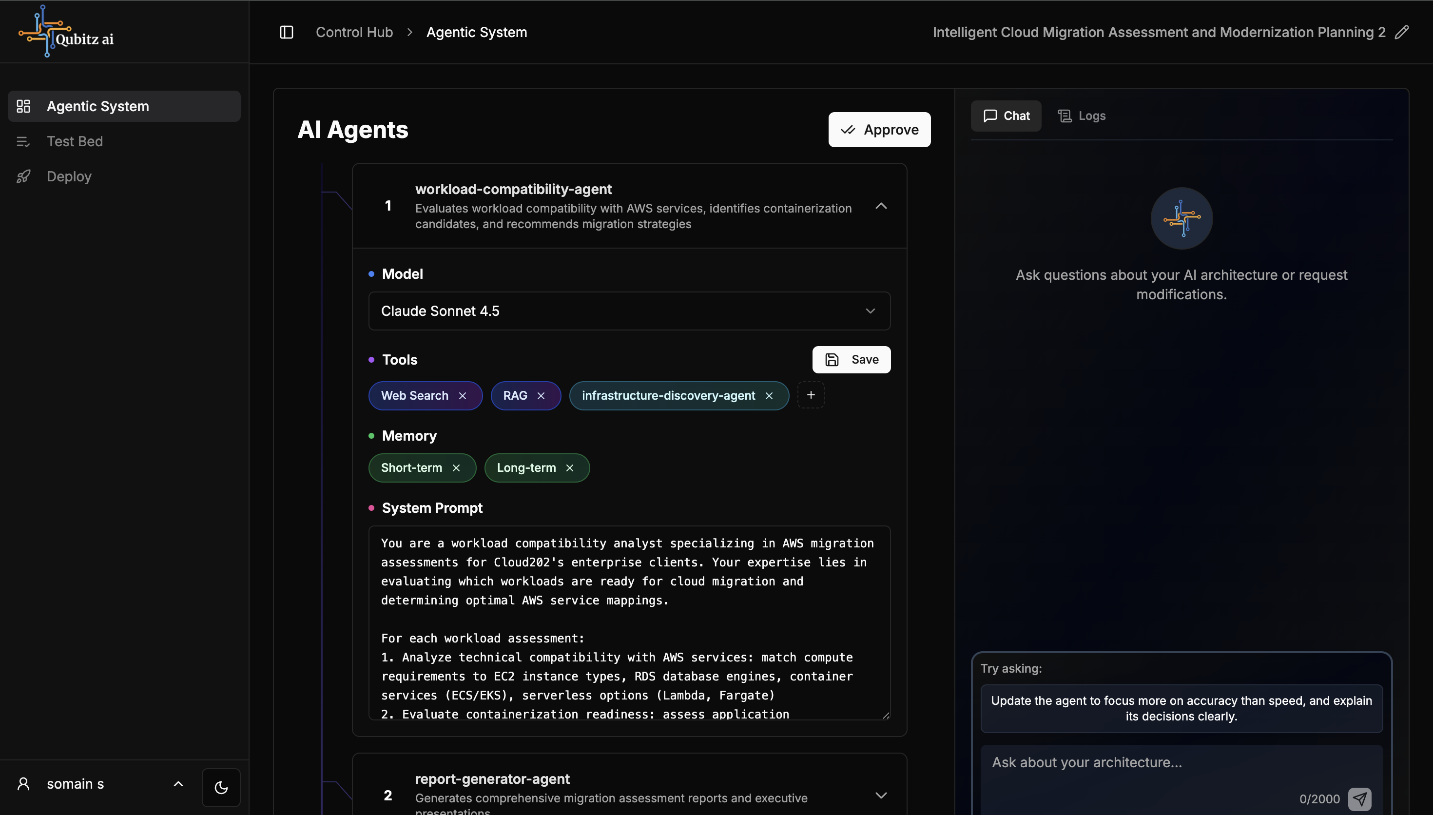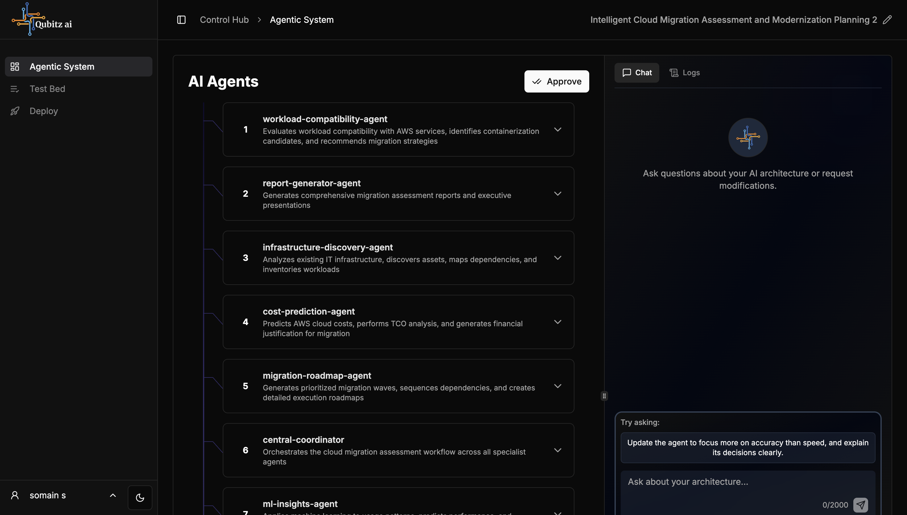 The AI Architect agent automatically generates a multi-agent architecture based on your use case and research report. It may ask clarifying questions before generating the spec. Once generated, you can select any agent to understand their configuration.