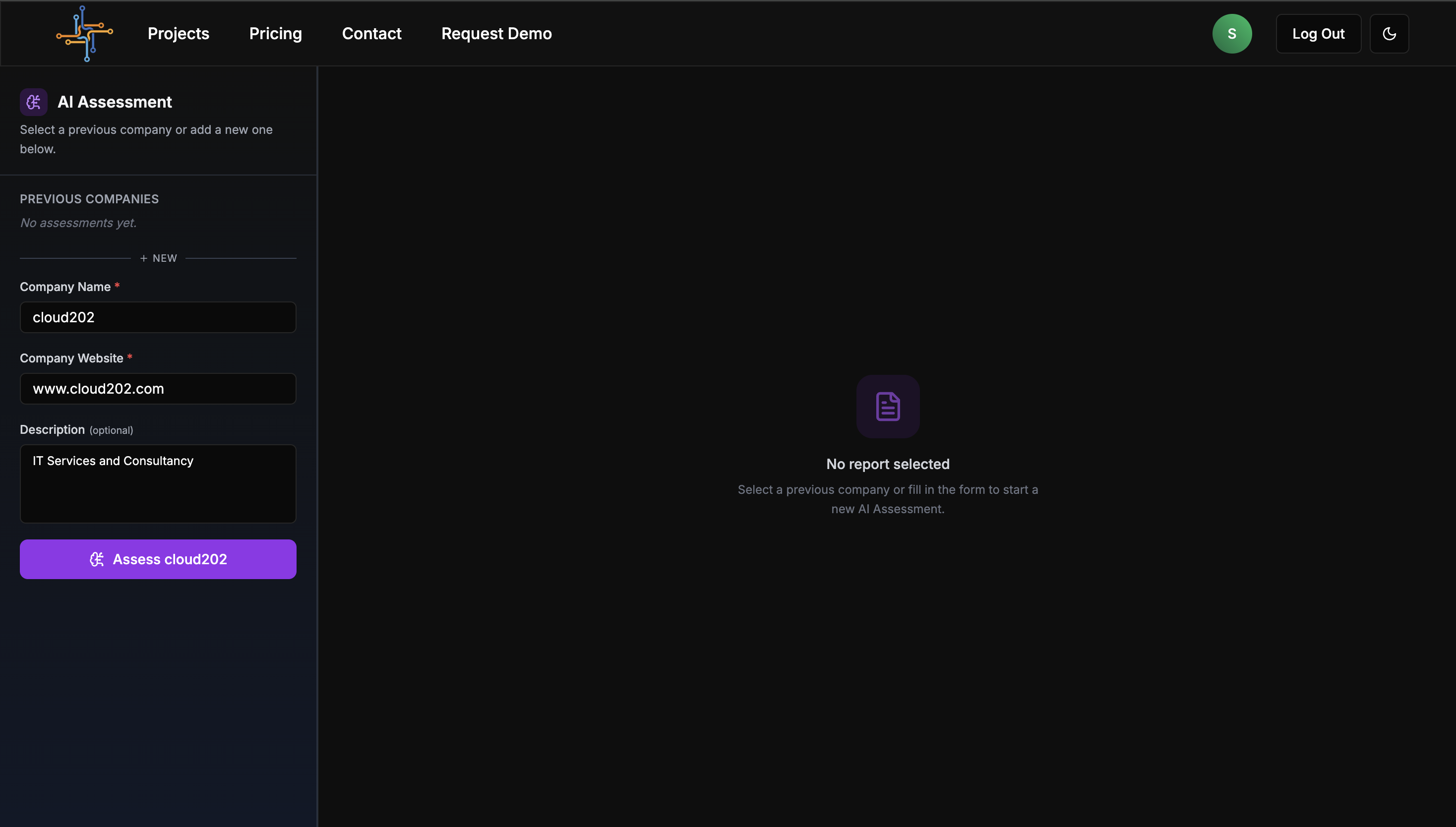 - Previous Companies -- Dropdown listing all companies you've assessed before. Selecting one loads its assessment history.