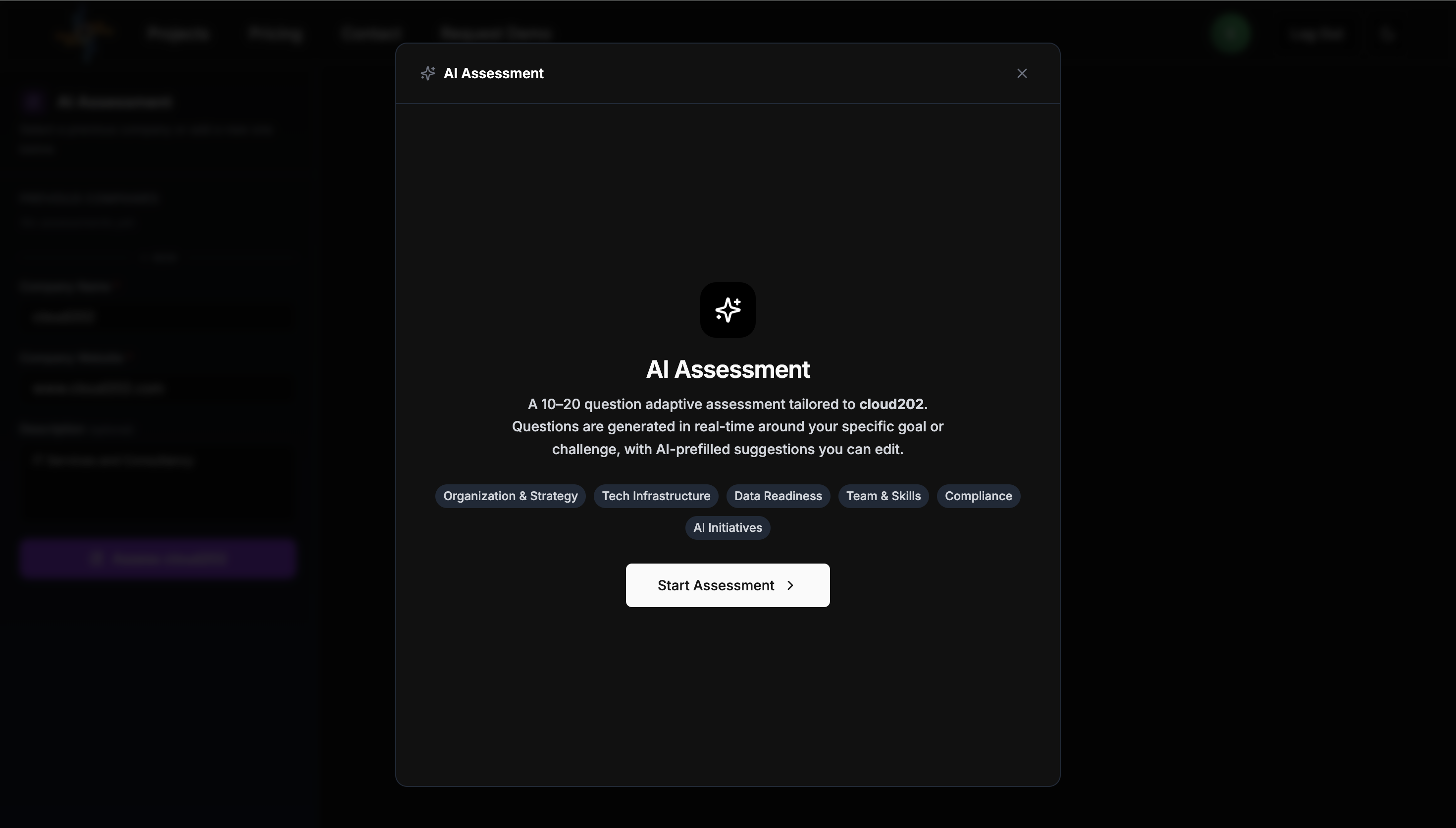 - Start Assessment -- Opens the AI Readiness assessment modal.
