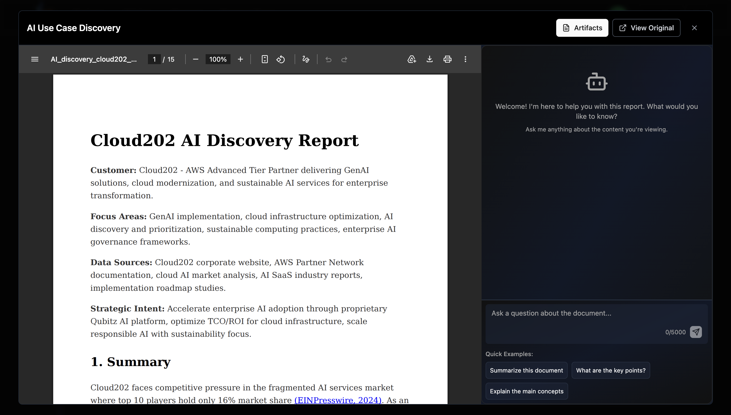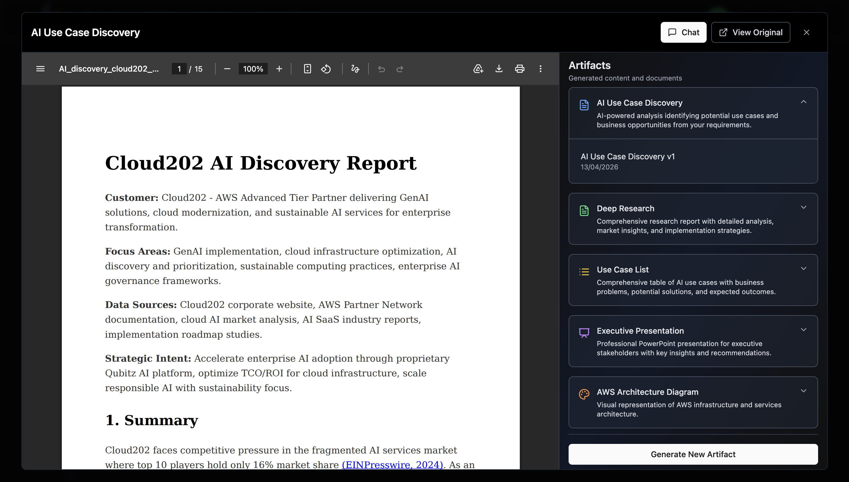 - Artifacts -- Start here! View your AI-generated artifacts like Use Case Discovery reports and Deep Research documents. You can also chat with the AI to explore new ideas.