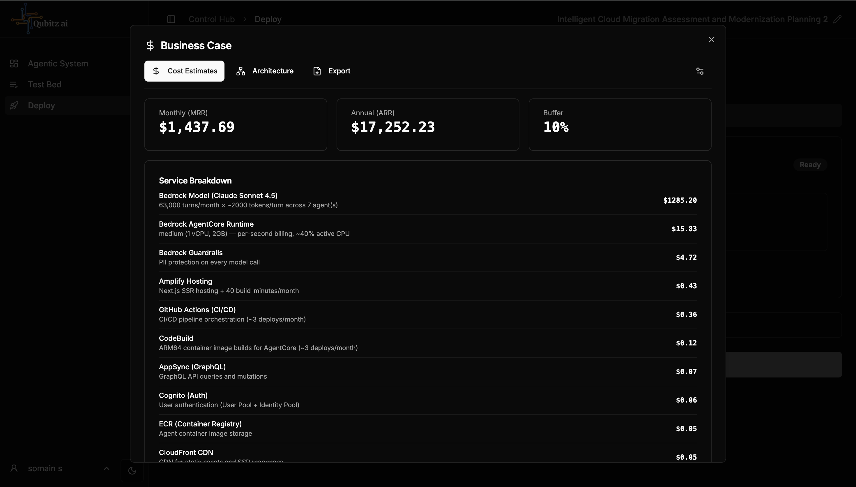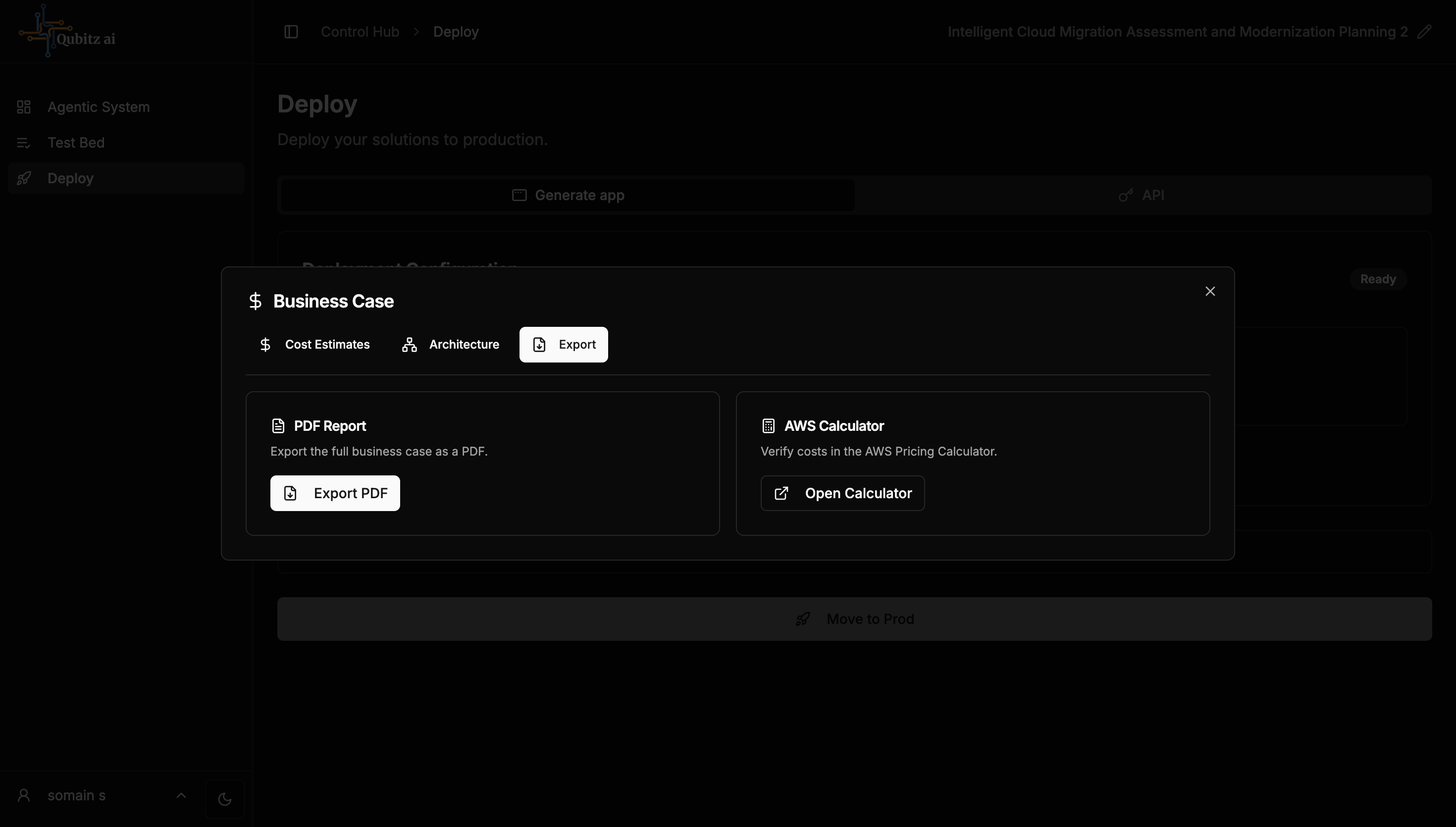 - Export -- Export the business case as PDF. Also includes a link to the AWS Pricing Calculator to verify costs independently.