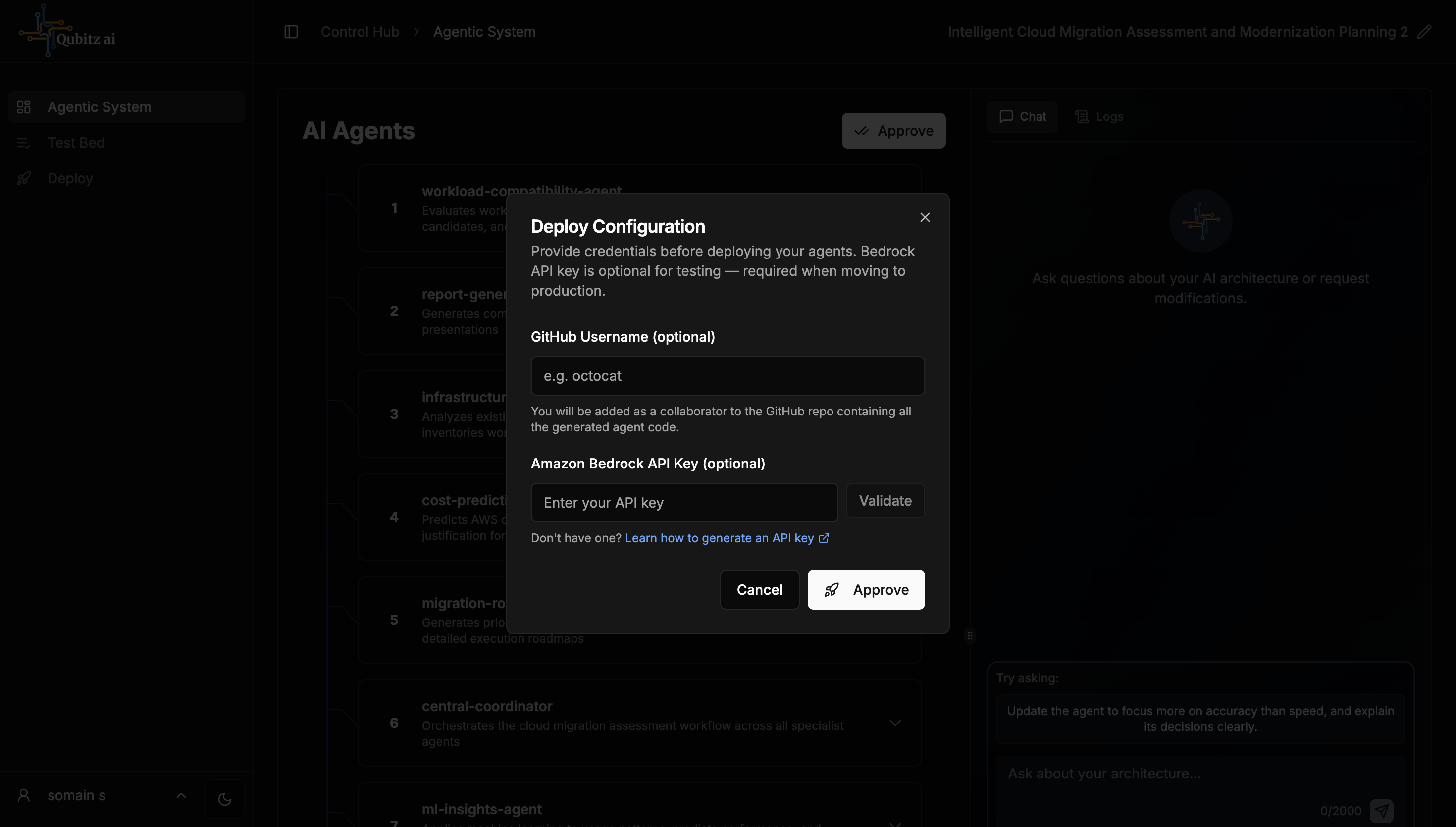 When satisfied with the configuration, click Approve. A Deploy Credentials dialog opens asking for your GitHub username and Bedrock API key. You can validate your Bedrock API key before proceeding with the deployment.