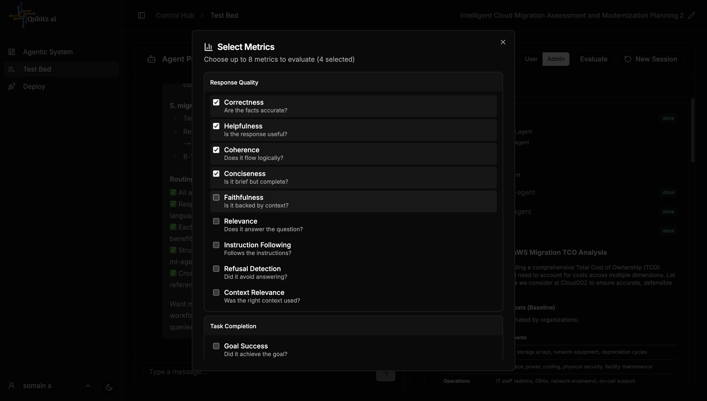 After testing, select the Evaluate button to choose up to 8 metrics across multiple dimensions: