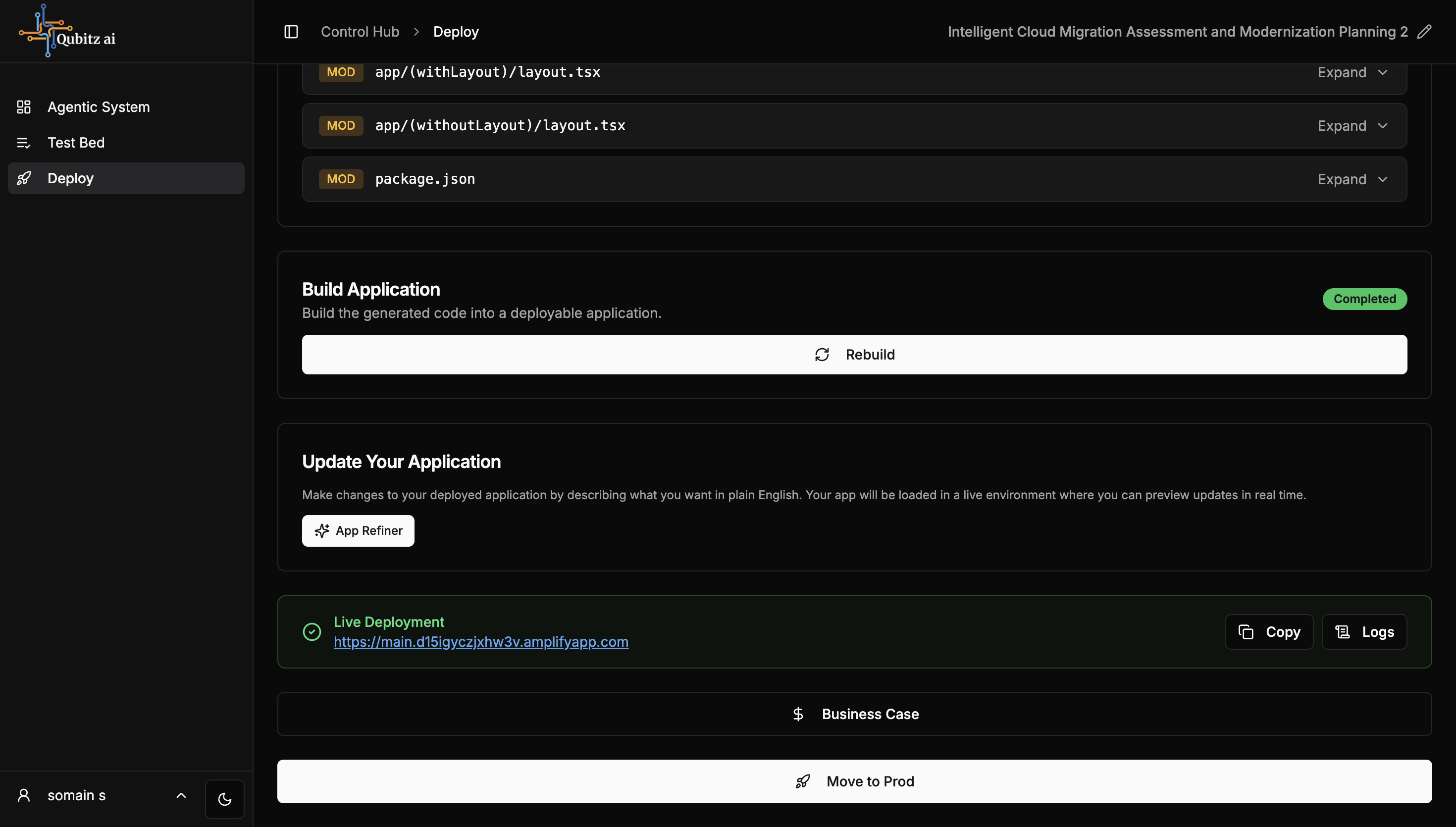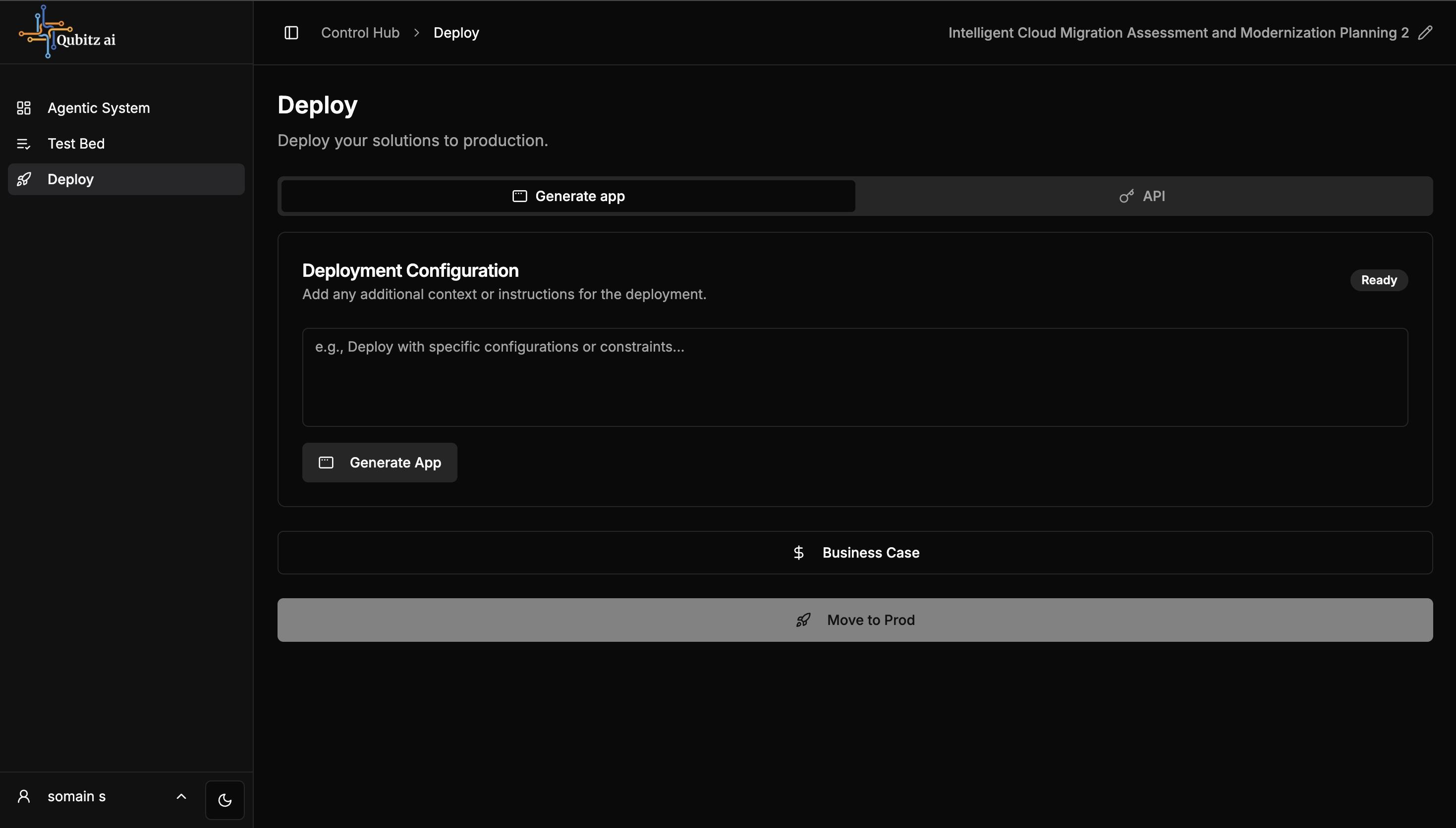Move to Prod -- Available once your app is deployed. Moves your application to production and redirects to the Application Management dashboard.