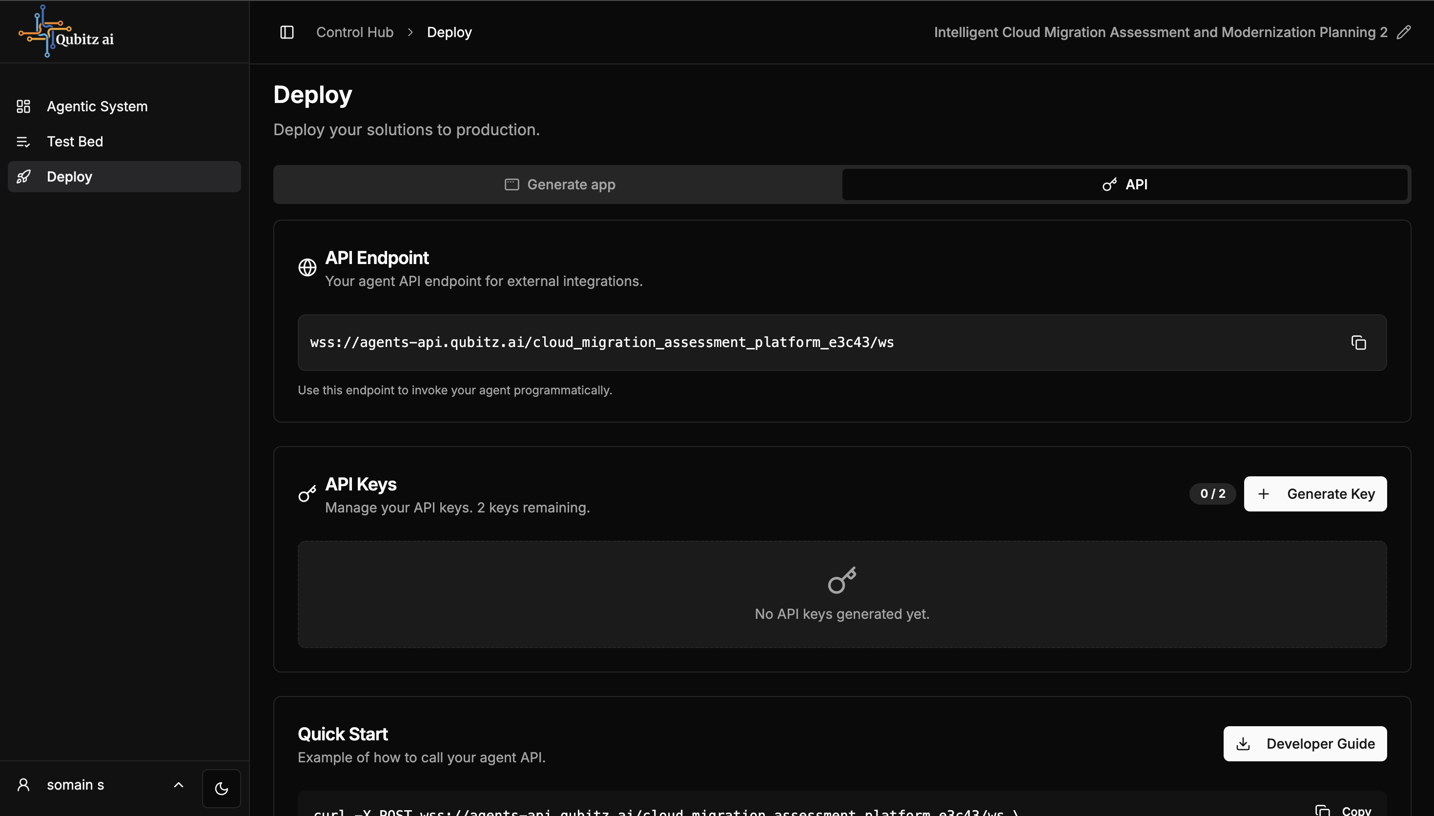 The Deploy tab has two inner tabs: Generate App and API.