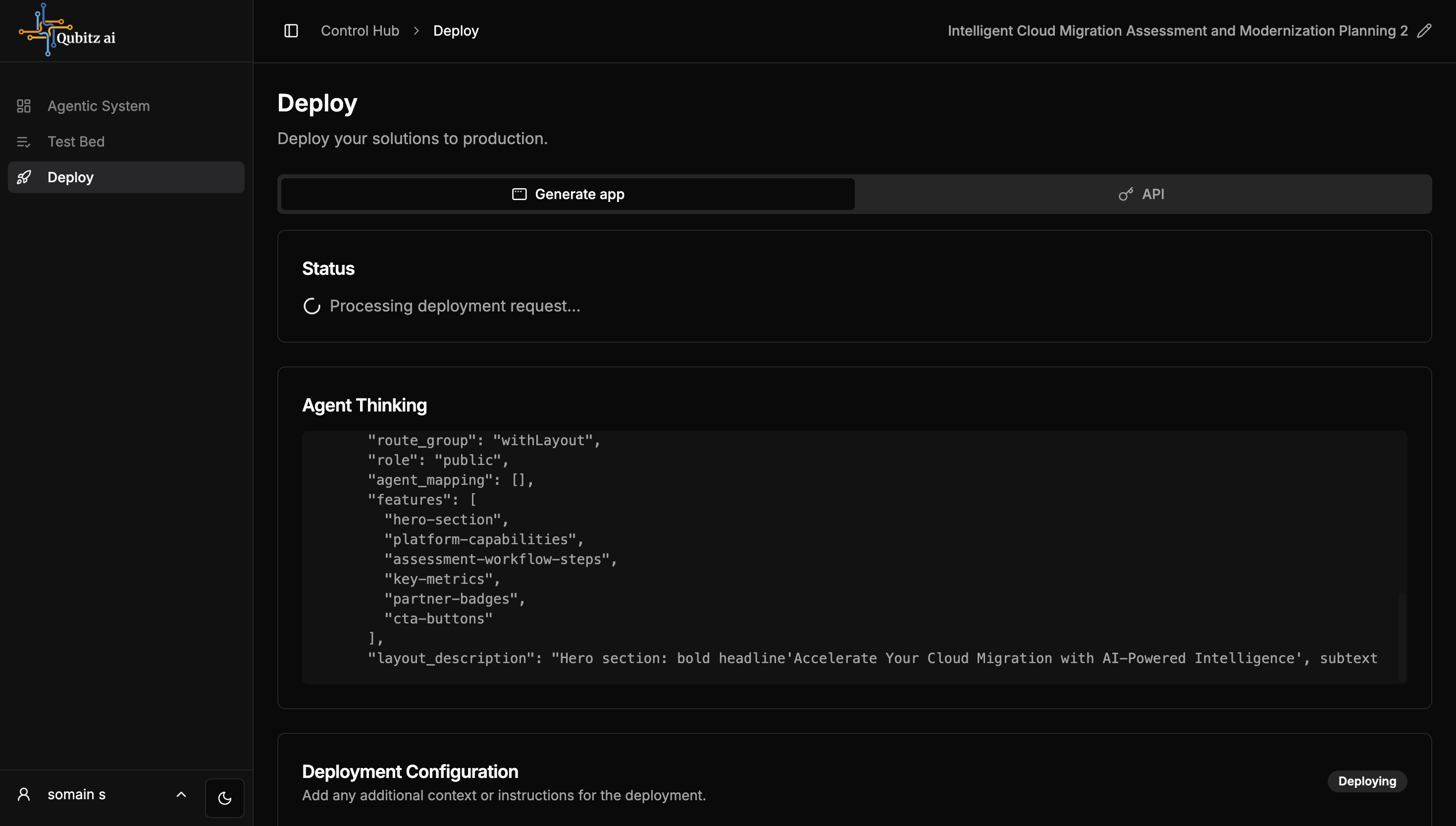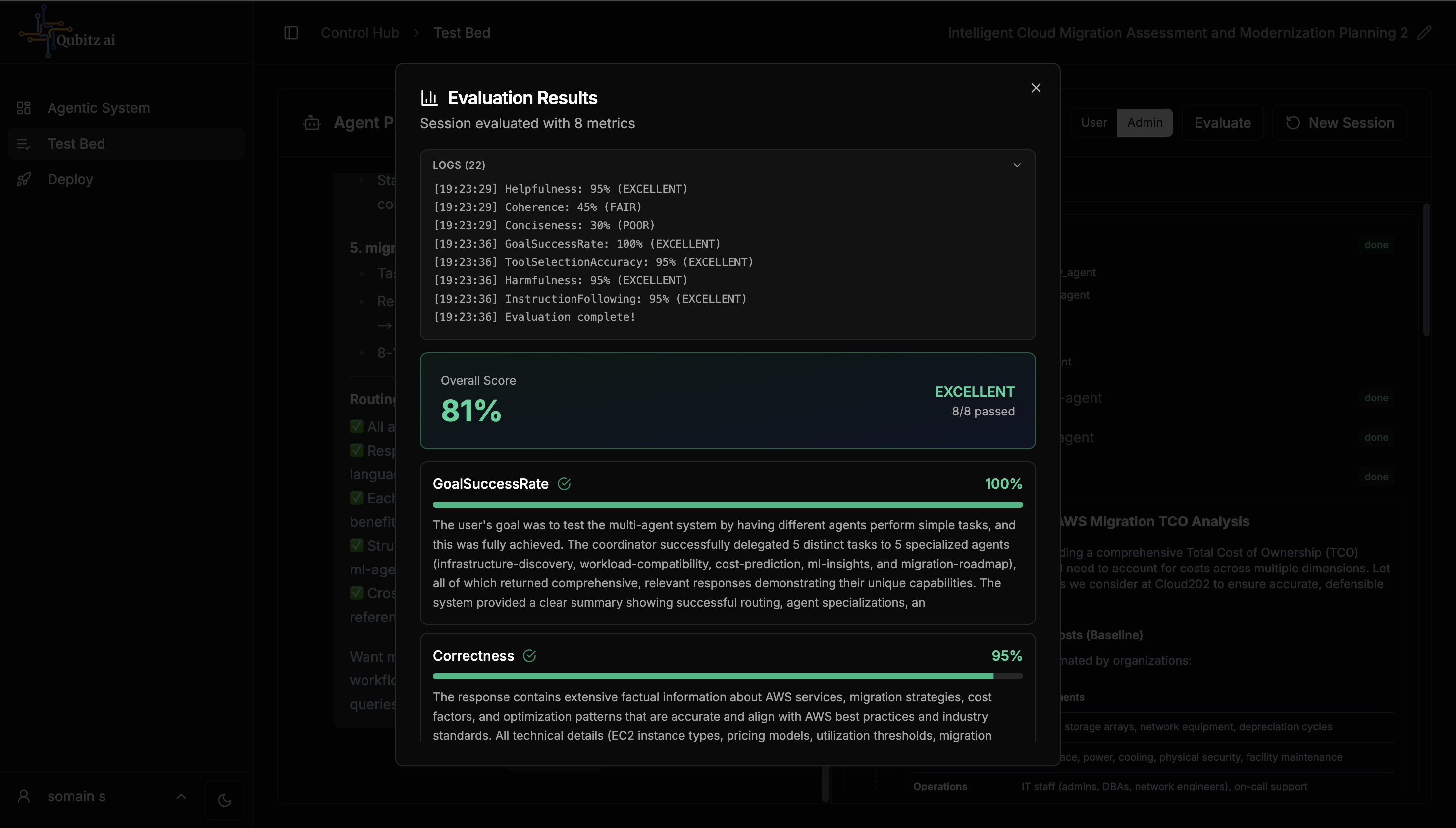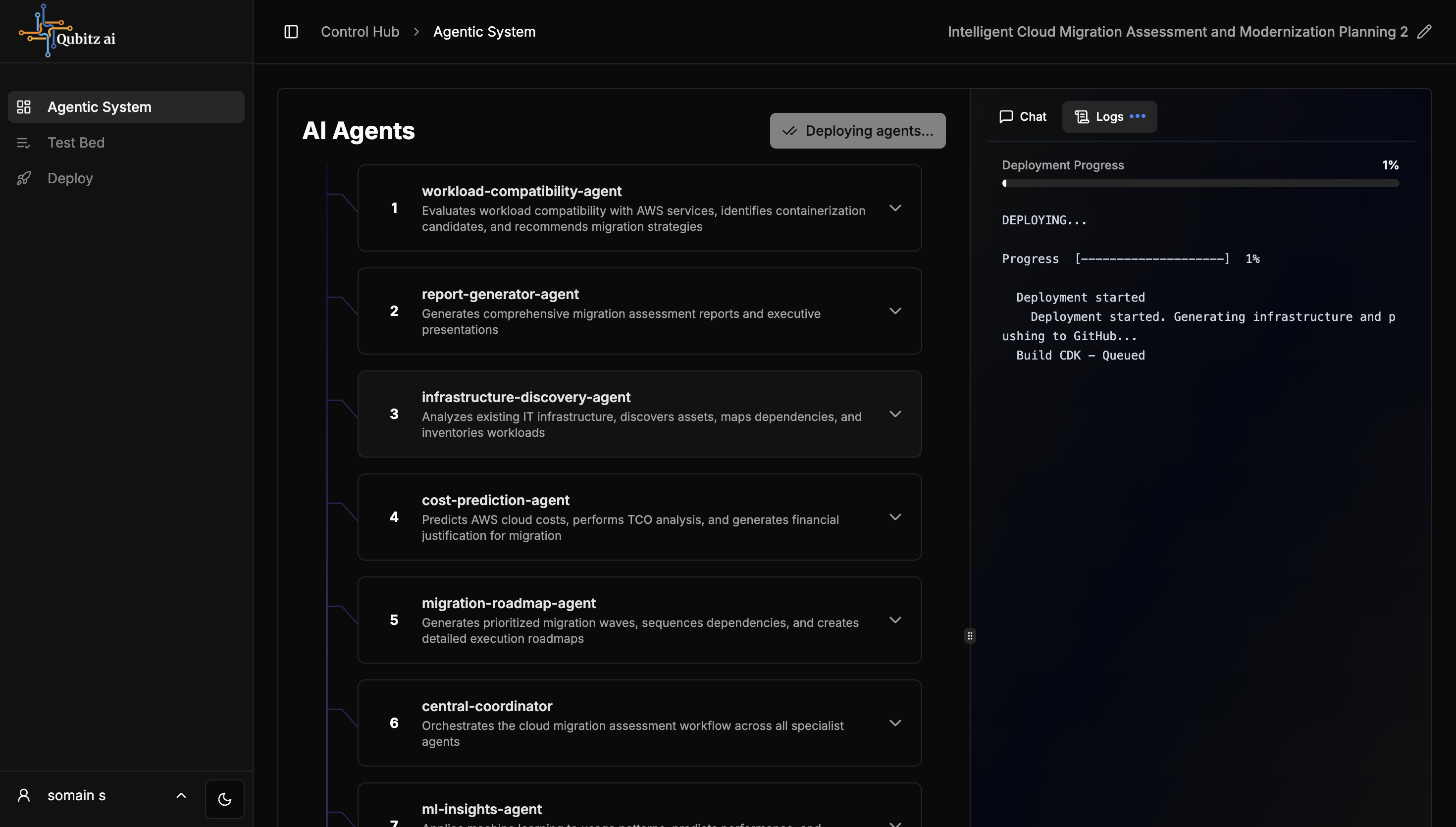 The deployment provisions your agentic system on AWS (AgentCore runtime). Deploy logs stream in real-time with a progress bar. On success, the Test Bed and Deploy tabs unlock.