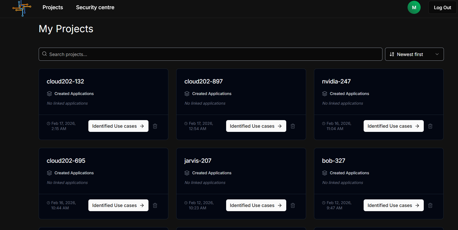 After analysis completes and the project is saved, clicking into My Projects opens the Project Dashboard -- the operational hub for reviewing, rating, collaborating on, and building from your generated use cases.