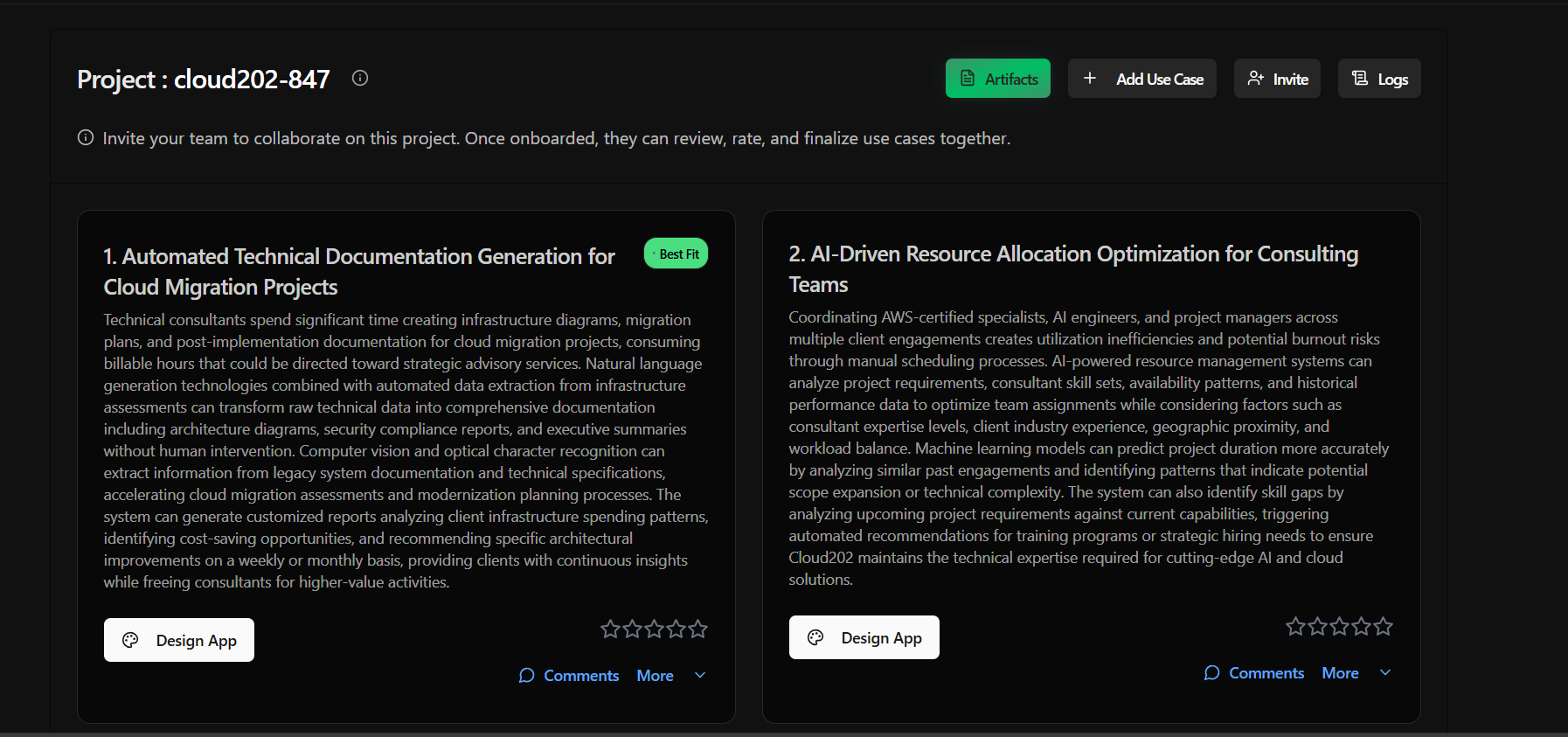 The operational hub for reviewing, rating, collaborating on, and building from your generated use cases.
